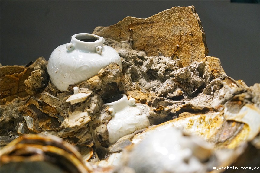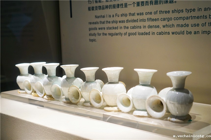 在博物馆内,展出最多的就是磁器了,2009年8月18日至9月26日,考古人员对“南海一号”进行了第一阶段试掘工作,出水了200多件来自江西景德镇、福建德化及浙江龙泉等地民窑瓷器,初步推断,当时这艘古船是从中国驶出,赴新加坡、印度等东南亚地区或中东地区进行海外贸易的,船上以磁器为主。